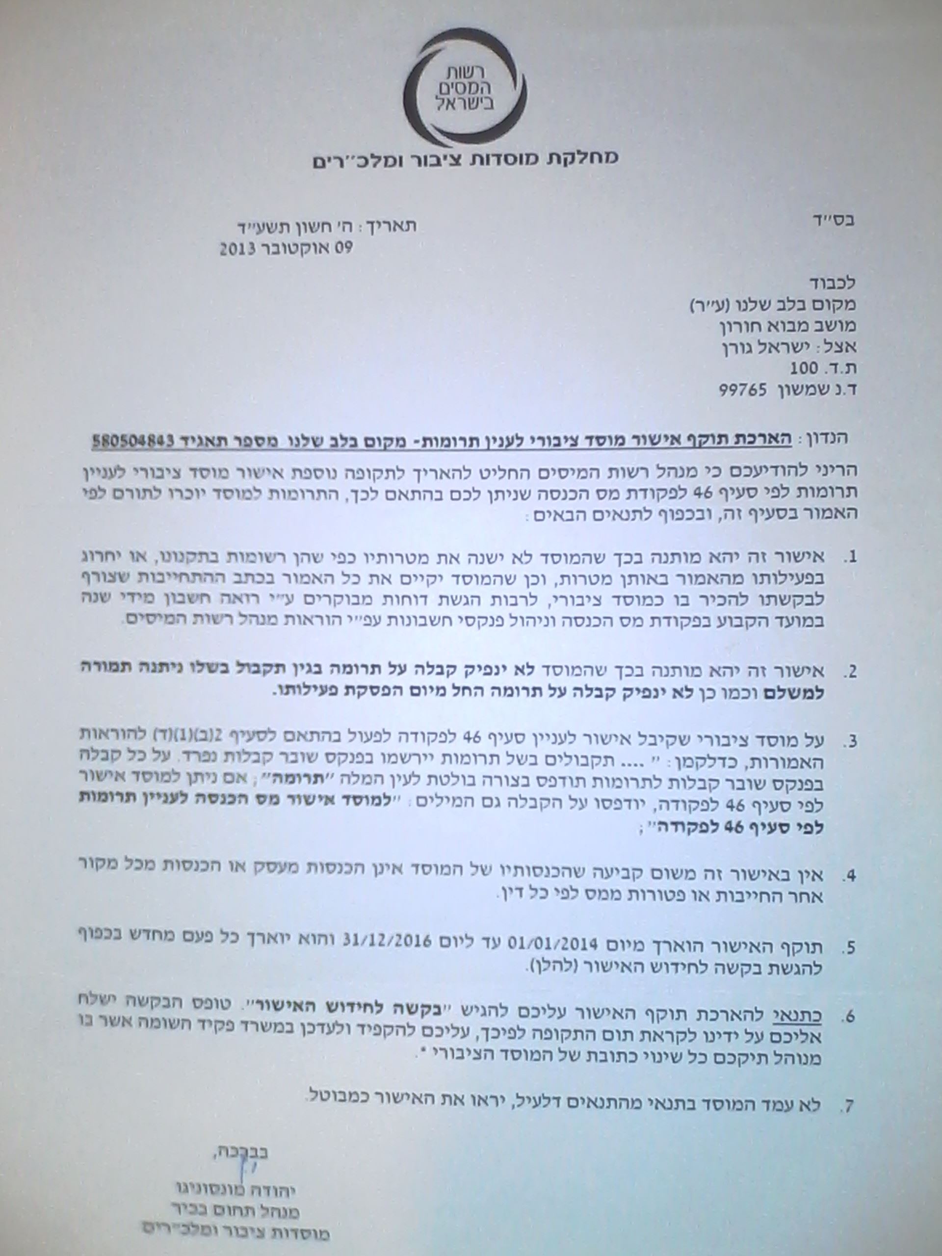 "זיכוי בשל תרומה שניתנה למוסד ציבורי לפי סעיף 46